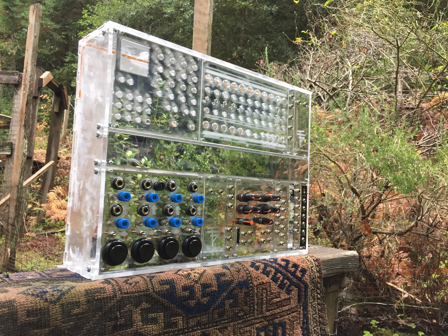These two examples are the exception rather than the rule, however, and as far as I can tell, there are no examples of designs that use qualities of the case to link the modules to the ambient environment. With all of that said, here’s are a few aspects of my case that are somewhat unique: It contains a photocell voltage processor, which responds to ambient light under most conditions, but, when a LED strip is activated (via voltage control) the two way mirror material I designed the modules out of reflects internal light rather than passing light in from the environment. This means that the external environment influence on the sound can be overridden via voltage control. It also looks cool as hell when it’s lit up. Most of the case is passive, so it can process sound, even without using the internal power supply, although this does lead to a drop in volume.